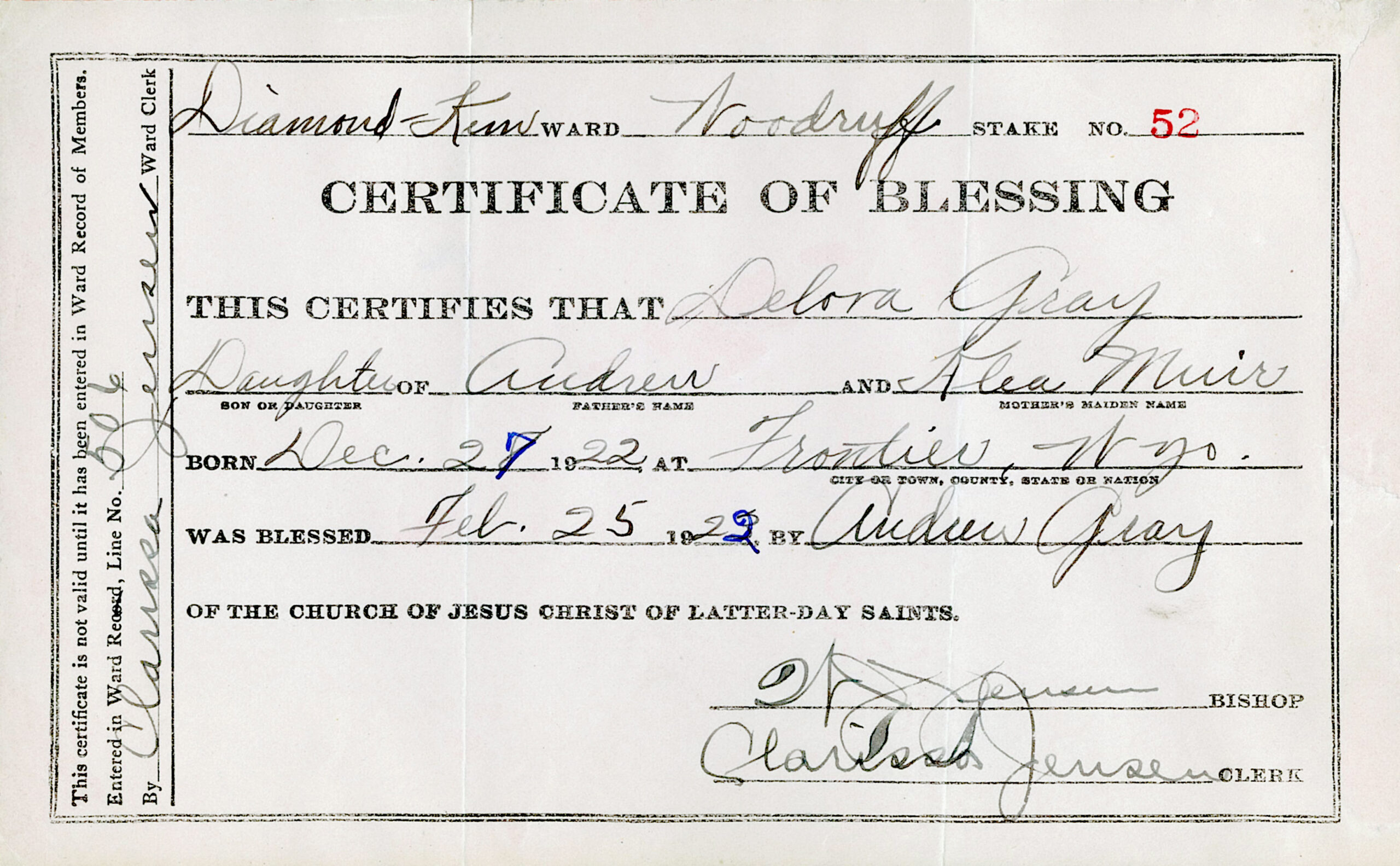 Certificate of Blessing for Delora Gray