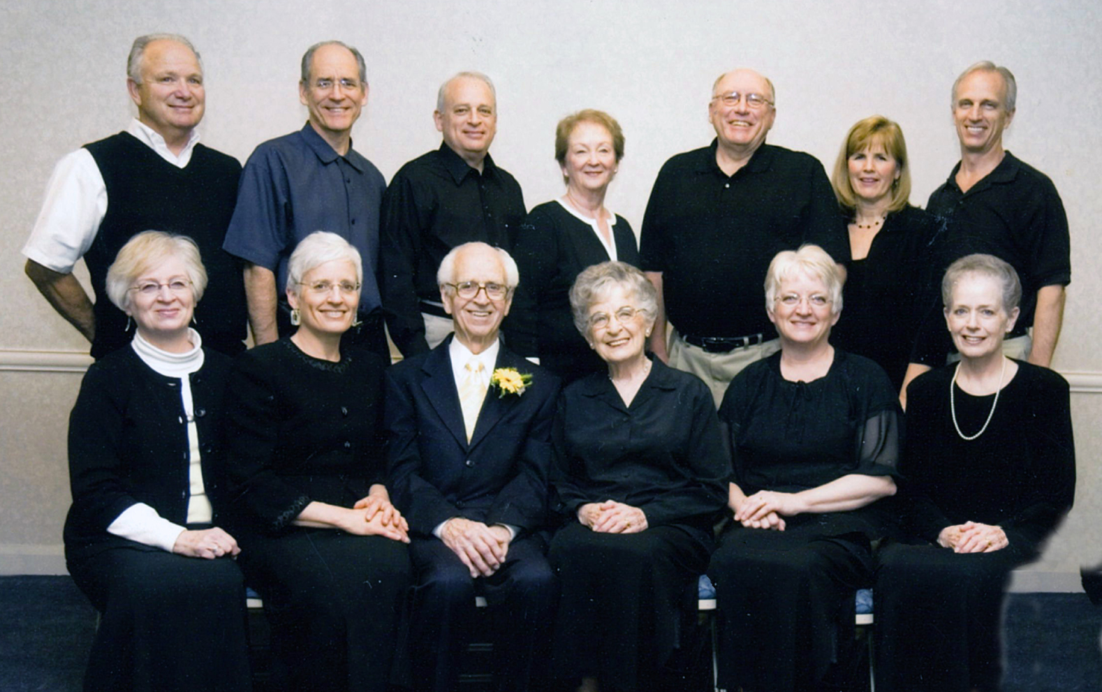 Ray Garrett's 90th Birthday Celebration April 2008 - BR Doug Linde, Chuck Gilmore, Rand and Karen Garrett, Blaine Greenhalgh, Nanette and Vern Garrett, FR Shauna Linde, Judy Gilmore, Ray and Delora Garrett, Jan Greenhalgh, Barbara Guzman
