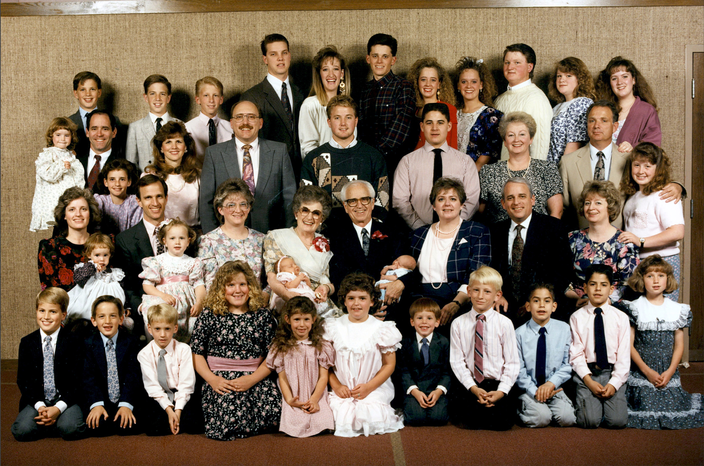 Barbara and Joseph 50th Wedding Anniversary with Grandkids - Back Row: Reg Garrett (Ralph's), Steve Richins (Dora's), Rand Garrett (Ray's), Shauna Garrett (Ray's), Diane Edmunds (Lois's), Joanne Edmunds Anderson (Lois's) Charlene Edmunds (Lois's), Alene Richins (Dora's), Jean Kay Edmunds (Lois's) Robert Richins (Dora's), Lynn Richins (Dora's) Second Row down: Debbie Garrett (Ralph's), Jan Garrett (Ray's), Judith Garrett (Ray's), Ray Garrett (Ralph's), Deann Richins (Dora's), Mom Garrett, Gaylen Garrett (on lap..Max's), Dad Garrett,(Joanne Anderson's baby on lap), Wayne Mackay (Ruth's), Kay Mackay (Ruth's), Barbara Garrett (Ray's), Brent Mackay (Ruth's)