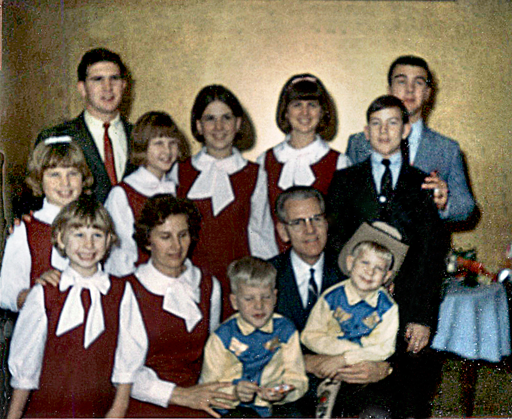 Maxfield Family 1966 Back Row - Neal, and Nelden Middle Row - Nanette, Nila, Nita, Nadine, and Norm Front Row - Natalie, Elaine, Ned, Vard and Nalin