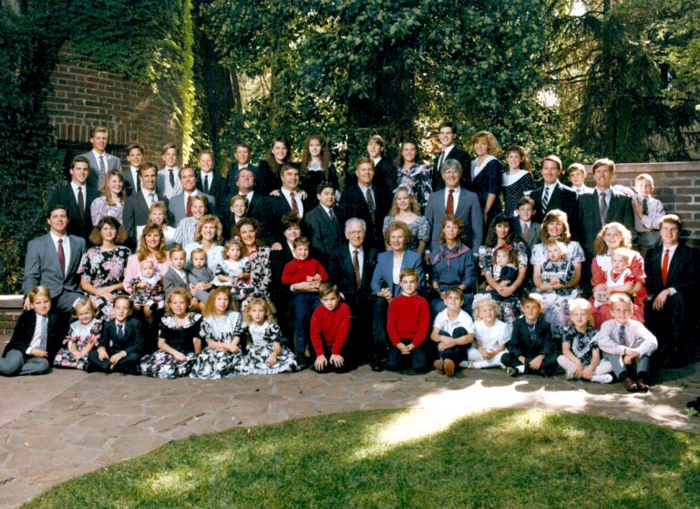Maxfield Family 1974 - Back Row - Neal, Nila, Nadine holding Doug, Richard holding Jonathon, Nalin, Norm, Wendy, Ned, Nelden, and Nanette Front Row - Adam, Judy holding Maren, Tucker, Vard, Elaine, Natalie, and Nita