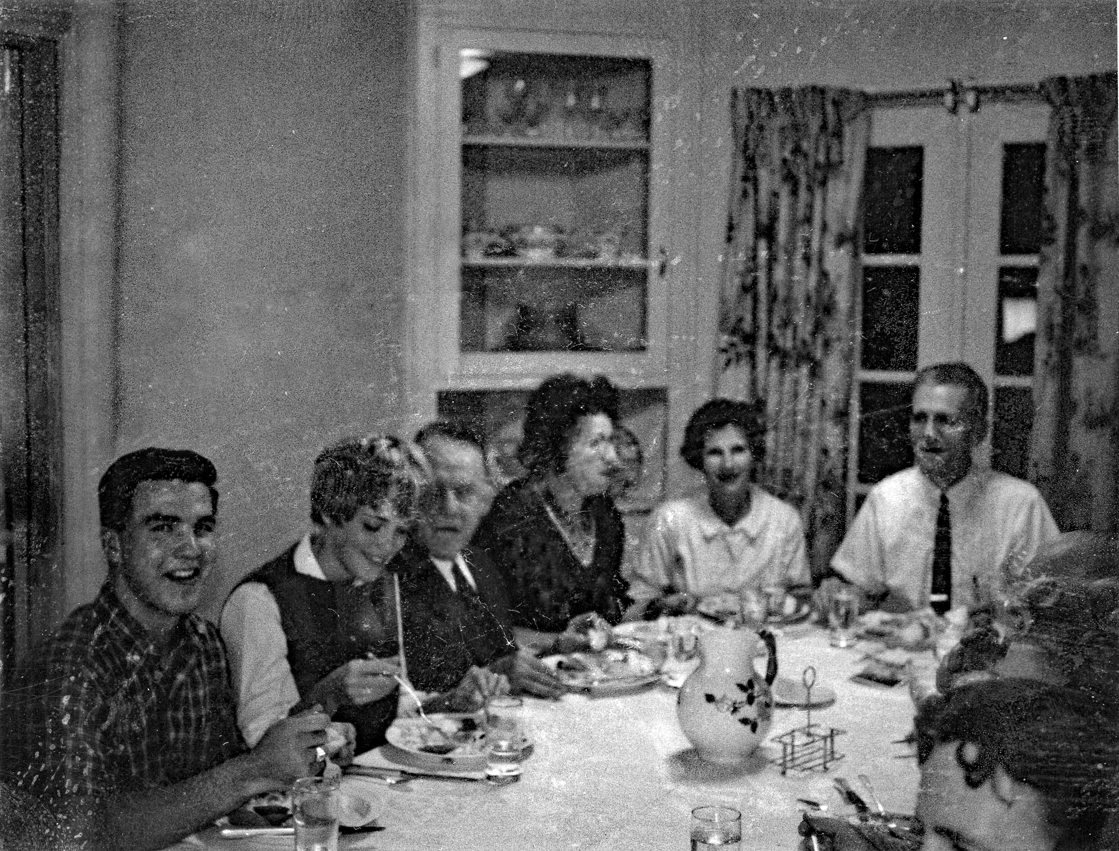 Dinner at Maxfield's -1963 Nelden, girlfriend, Lorenzo (Dad) Elggren, Olive Elggren, Elaine Maxfield, and Vard Maxfield