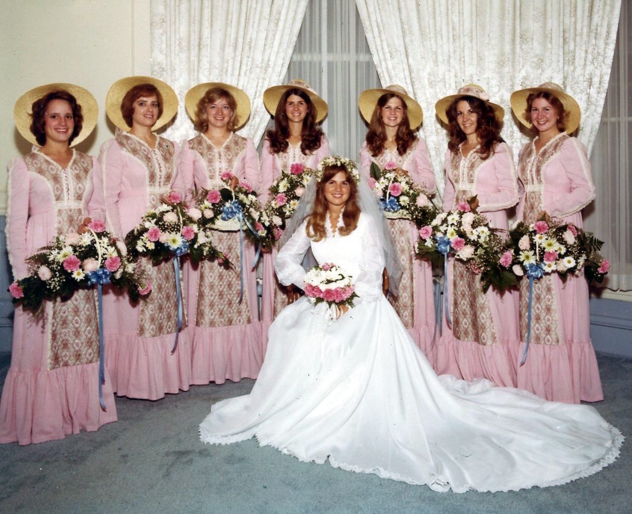 Nanette with her Bridesmaid L-R Up the stairs - Jan, Barbara, Judy, Nita and Natalie - Front L-R Nila, Nanette and Nadine